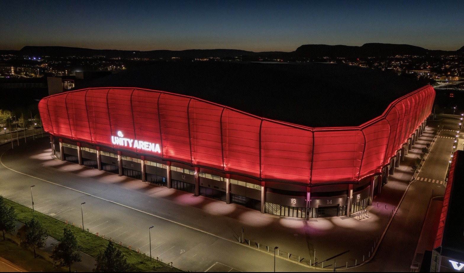 Også Fornebu og Lysaker Rotary markerte poliodagen med lyssetting av Unity Arena.